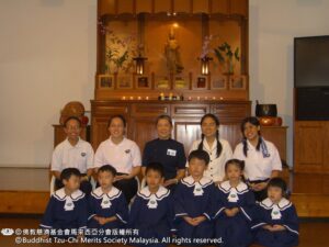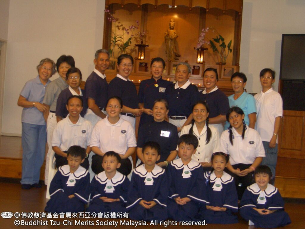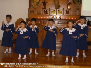 午間一時,畢業典禮正式開始。在司儀蔡麗珍師姊的帶領下,六位畢業生手捧心燈,整齊不紊地在大殿列隊入場,稚氣臉龐寫滿認真的神情;魚貫地站在臺上,把手中點燃的心燈,小心翼翼地傳到學弟妹的手中,象徵把慈濟精神代代相傳,勸勉弟妹們努力學習,做個有情有愛的菩提種子。