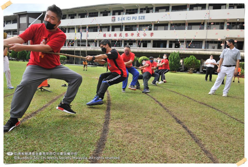 活动尾声的拔河比赛中,家长们齐心协力,感受”人多力量大”的团结精神。幼儿园老师梁美真特别说明:”虽然防疫措施已放宽,我们仍提供洗手液,确保每组孩子使用后都进行消毒。”