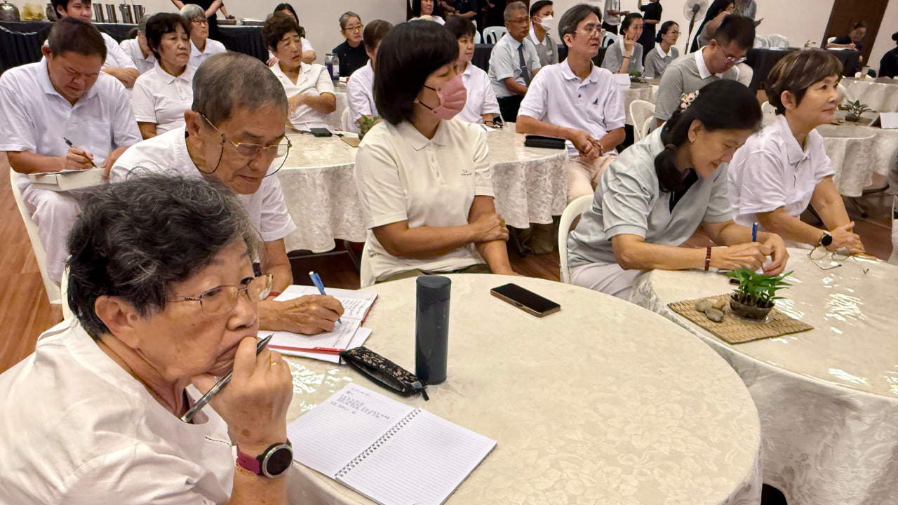 共修開始,大家虔誠念誦慈濟十戒與志言,並以梵唄勇健活動身心。陳如德(本和)師兄以在地的方言,用簡易的方式與大家分享如何以正念勤修「學與覺」。大家用心記錄分享的內容,在如德師兄的風趣帶動之下,學習如何長養正念。長照班的長者和新進志工認真聆聽,並將重點逐一寫入筆記。