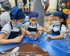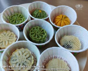 接着,孩子们分成四组围坐在桌前,在志工的陪伴与指导下,从揉面团、包馅、搓圆到压模,每一个步骤都认真学习。有人小心翼翼地包着馅料,有人开心地挑选花纹模具,压出一个个漂亮的月饼图案。志工们的鼓励与协助,让每个孩子都能体验到亲手制作的乐趣。