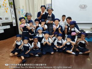 最后孩子们捧着自己亲手制作的净斯月饼,兴奋又欢喜地与志工们合影留念。
