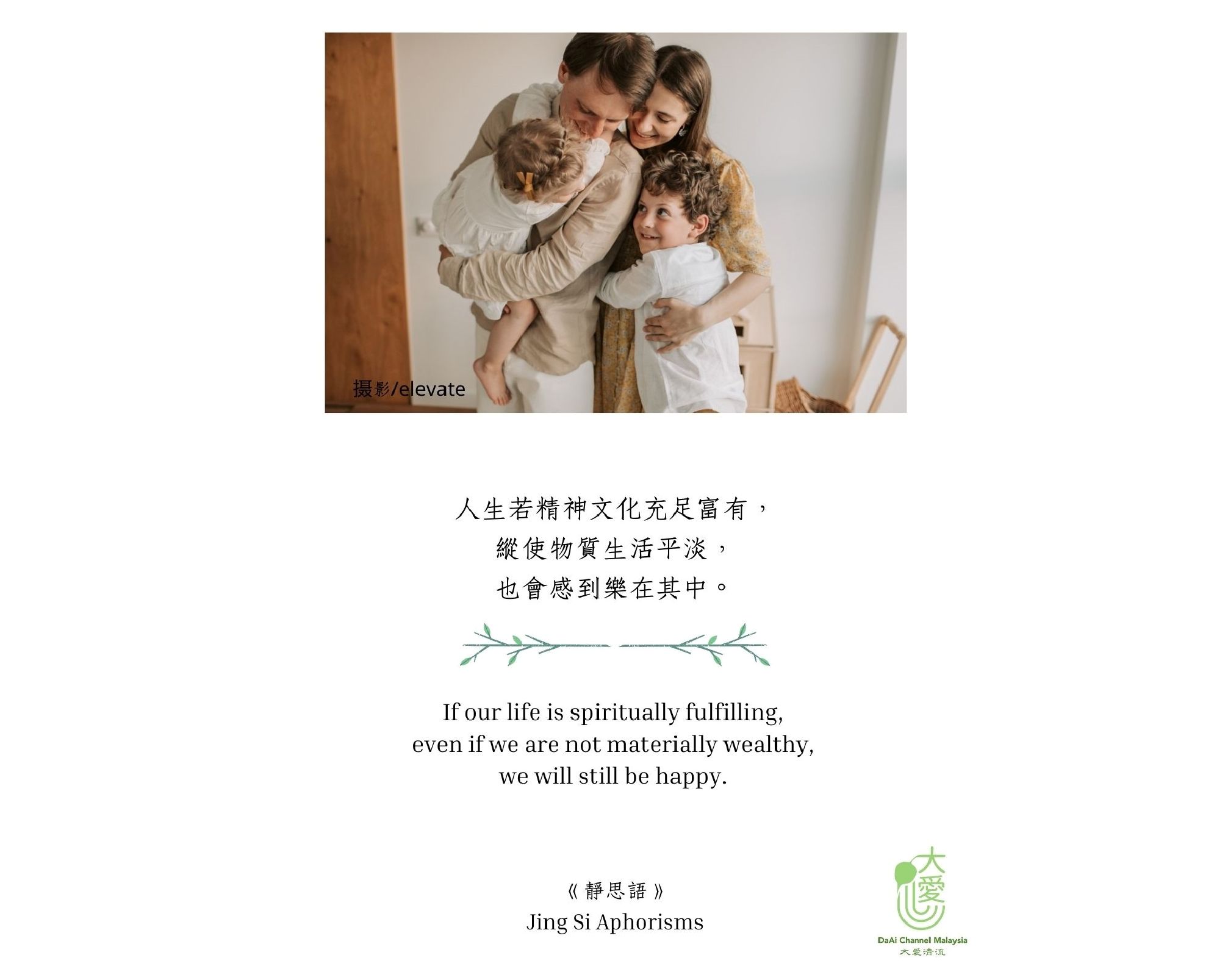 人生若精神文化充足富有,縱使物質生活平淡,也會感到樂在其中。—— 證嚴法師《靜思語》