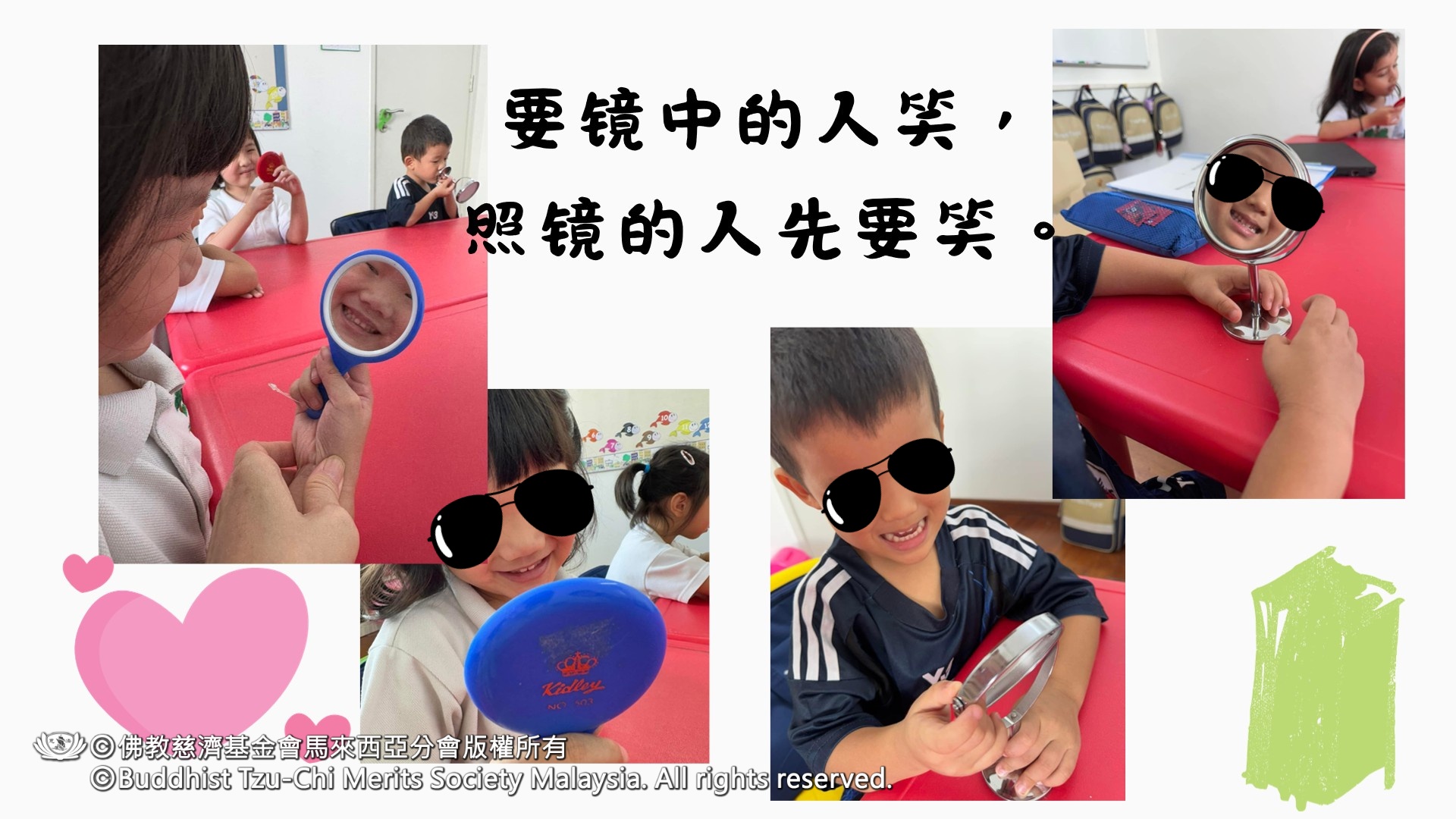 在静思语课堂“要镜中的人笑,照镜的人先要笑”上,曾老师将5岁和6岁班合并教学,一步步依照教案推进。在“镜中人先笑”的活动中,她发现孩子们原本不爱笑,但在镜中看到自己的苦脸后,开始尝试微笑,并意识到“笑容让自己更好看”。这一小小的转变,成为孩子自我接纳的起点。