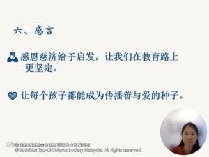 “感恩慈济提供资源,让我们有信心走下去。”黄秀奋在分享末了诚挚地说。面对困难,她以积极态度寻找解答,一步一步在方法与成长的路上前行。她也感恩有一群同行的教育伙伴,让这条播种人文、以心育人的道路,充满温暖而不孤单。