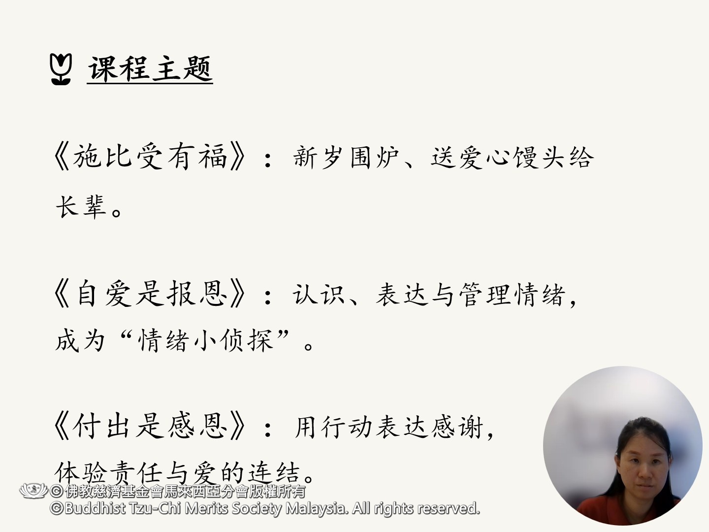 2025年11月1日,在槟城慈济教育中心举办的“第一届大爱引航之友联谊会”上,来自绿苗安亲班的黄秀奋老师,作为三十三所参与机构的七位分享代表之一,娓娓道来她如何将慈济的人文教案,化为孩子生命中看得见、做得到的日常行动。