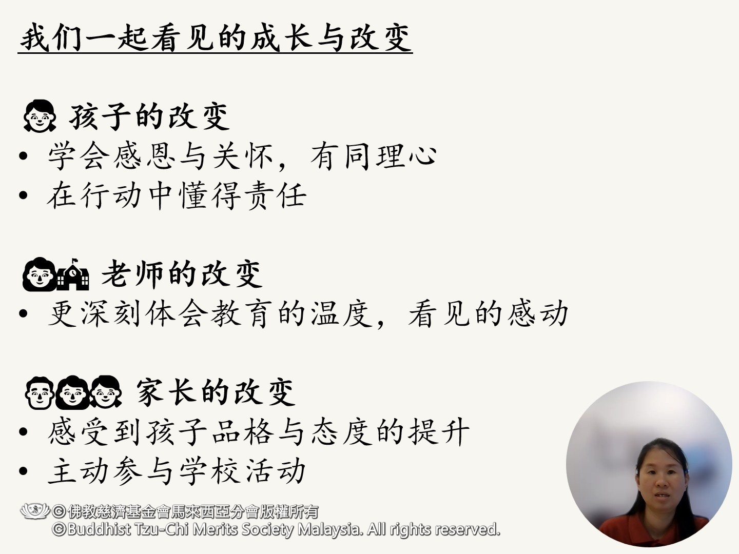 “感恩慈济提供资源,让我们有信心走下去。”黄秀奋在分享末了诚挚地说。面对困难,她以积极态度寻找解答,一步一步在方法与成长的路上前行。她也感恩有一群同行的教育伙伴,让这条播种人文、以心育人的道路,充满温暖而不孤单。