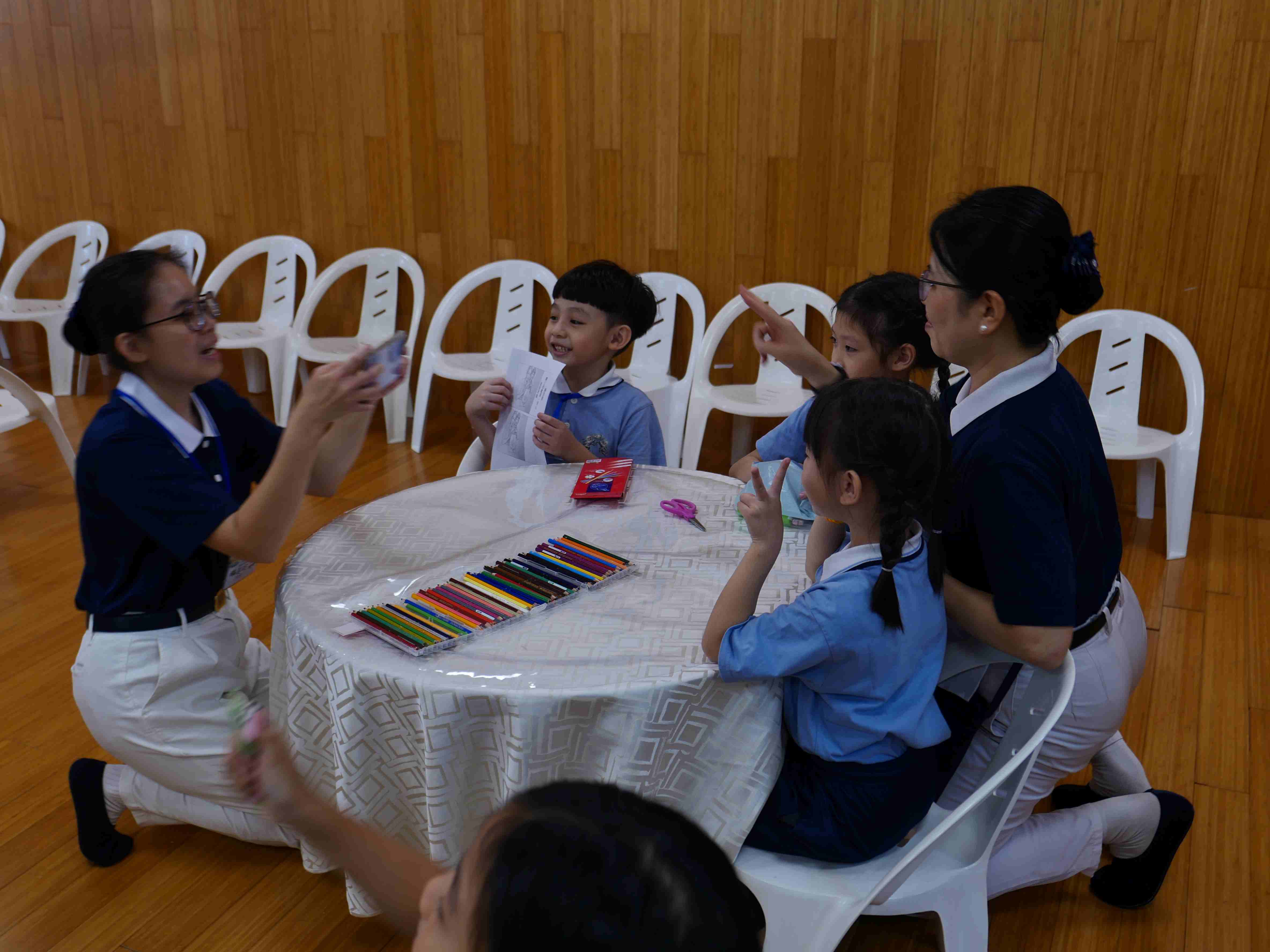 緊接着,活動進入了最動人的環節——奉茶報恩。在老師們的引導下,“小菩薩”們分组端着茶盤,步履稳重地步入感恩堂,来到各自的父母面前。他們恭敬地跪下,双手為父母奉上一杯热茶。當父母從孩子手中接過這杯充滿敬意的茶,輕嚼入口時,内心的感動與欣慰溢于言表。飲茶後,家長們也以一颗象征慈濟大爱精神的“慈濟軟糖”回饋孩子,甜在嘴里,暖在心頭。這温馨的互動讓現場洋溢着濃濃的親情,不少孩子深受感動,情不自禁地拥抱父母,淚水在眼眶打轉,慢慢的滑落了臉頰,場面真挚感人。
