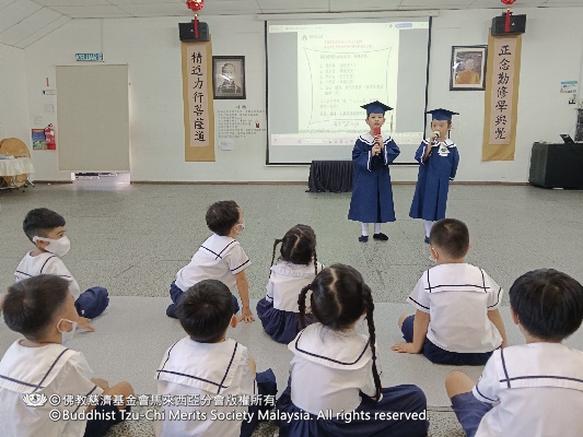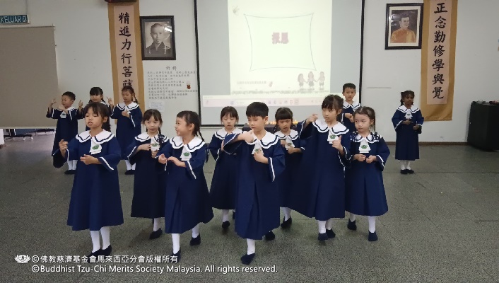 活動接近尾聲,勇氣班的哥哥姐姐帶來了經藏演繹《報恩》手語表演和「懷胎」戲劇。他們用生動的動作和深情的演繹,傳遞出孝道與感恩之心,也帶出品德教育的核心,更展現了慈濟幼兒園代代相傳的愛與善念。