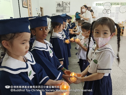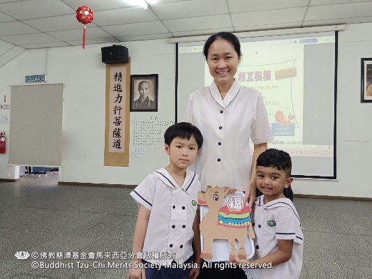 傳承心燈儀式完成後,老師分別請五歲班代表領取吉祥物「獅子」,四歲班代表領取吉祥物「駱駝」。師太上人的靜思語叮囑大家:「認真學習要用到赤子的真誠、駱駝的耐力和獅子的勇猛。」