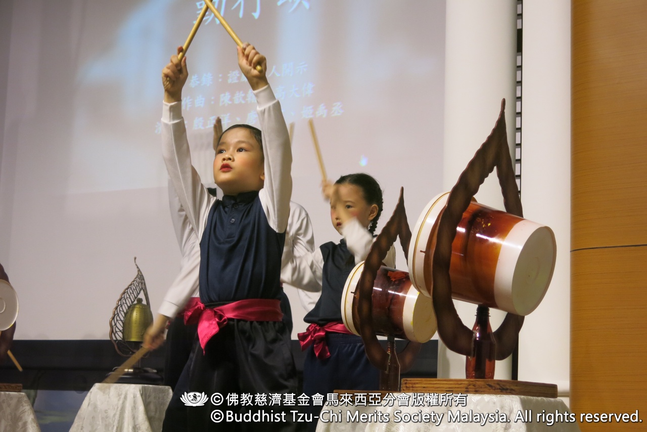 典礼在〈钟鼓勤行颂〉的庄严鼓声中拉开序幕,震撼人心的演出感动全场。随后,孩子们随着〈无量法门〉音乐合十步入感恩堂,并齐声唱诵〈慈济功德会会歌〉,神情专注稳重。