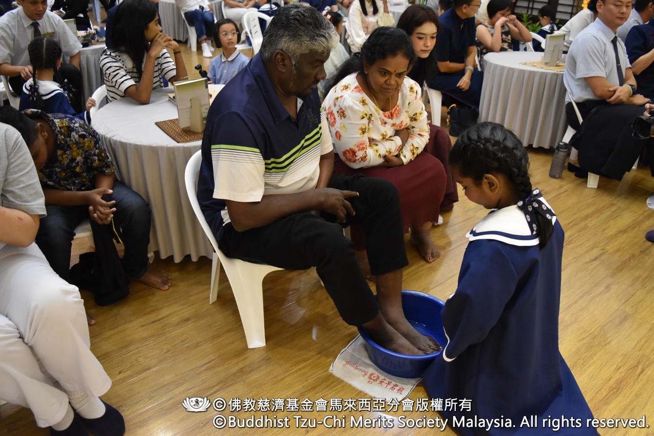 随后,孩子们行三跪九叩礼,并恭敬为父母及长辈浴足,以行动表达内心敬爱与感恩。慈济幼儿园师长亦带来手语〈许一个希望的未来〉,寄予诚挚祝福。
