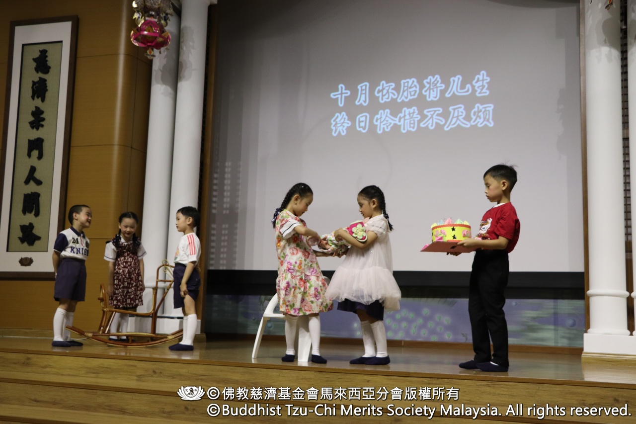 典礼中,孩子们透过手语、合唱、诵读及经藏默剧,演绎〈父母恩重难报经〉、〈返哺之恩〉等节目,表达对父母深重的感恩与忏悔之情。其中合唱〈一支草一点露〉、手语〈报恩〉等演出生动传神,传递孝亲之理。毕业生家长黄一宸父母及陈靖宣母亲亦上台分享与慈济的深厚因缘,体现孝爱真谛。