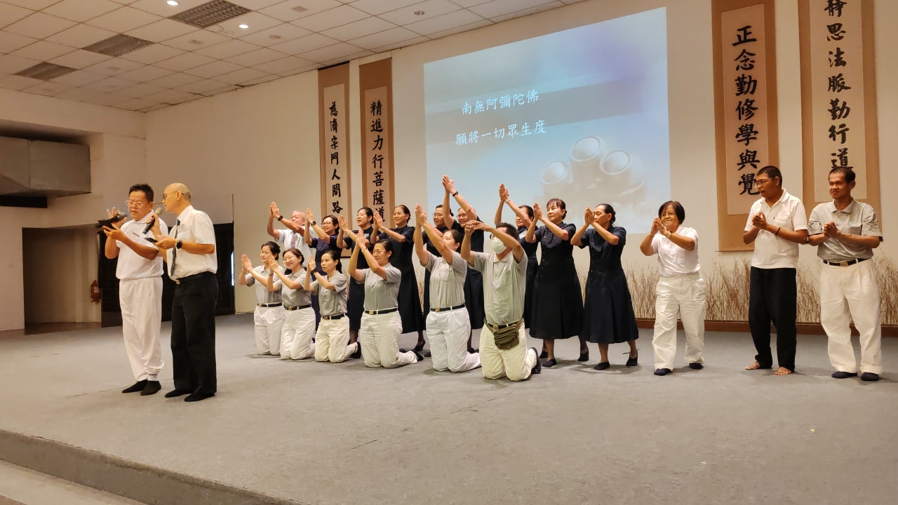 來到呈獻的時刻,大家注意上台,在聲聲歡笑中,認真演出每一首慈濟歌曲。大家年齡層不同,短短的十分鐘內練習好,最後大家都完美演出!