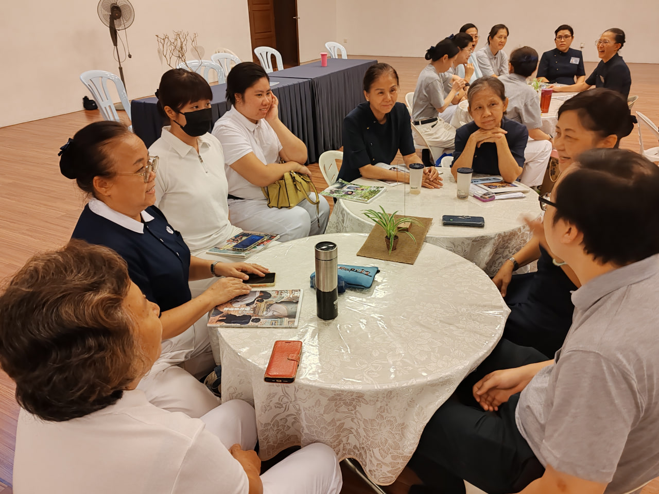 手語團隊帶動大家學習「人間菩薩行」的手語。接著,麥梅芳(懿泠)及唐順愛(慮珈)把大家分成四大組,每一組拿到一首之前共修時學過的慈濟歌,大家討論如何做呈獻。原本還以為大家會不懂怎麼呈獻,但意外發現只要有人提出建議,大家即能合作配合演繹。