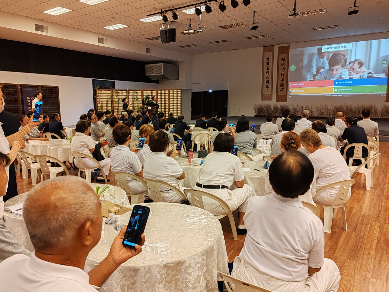 楊千卉(明璿)醫師準備了有關主題課程的小問題,帶動大家以手機玩線上的遊戲,讓大家來搶答問題。現場多半是長者,但人人皆手中有一機,大家在指令下必須辨認對的答案顏色才選答案,現場笑聲此起彼落。羅健瑛(慈堉)師姊受英語教育,多年來在慈濟裡,雖然語言不通,卻努力學習中文、深入上人的法,這一次很開心能以玩遊戲的方式活躍腦細胞。