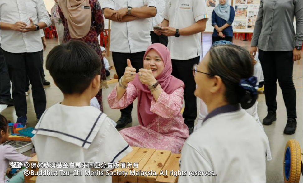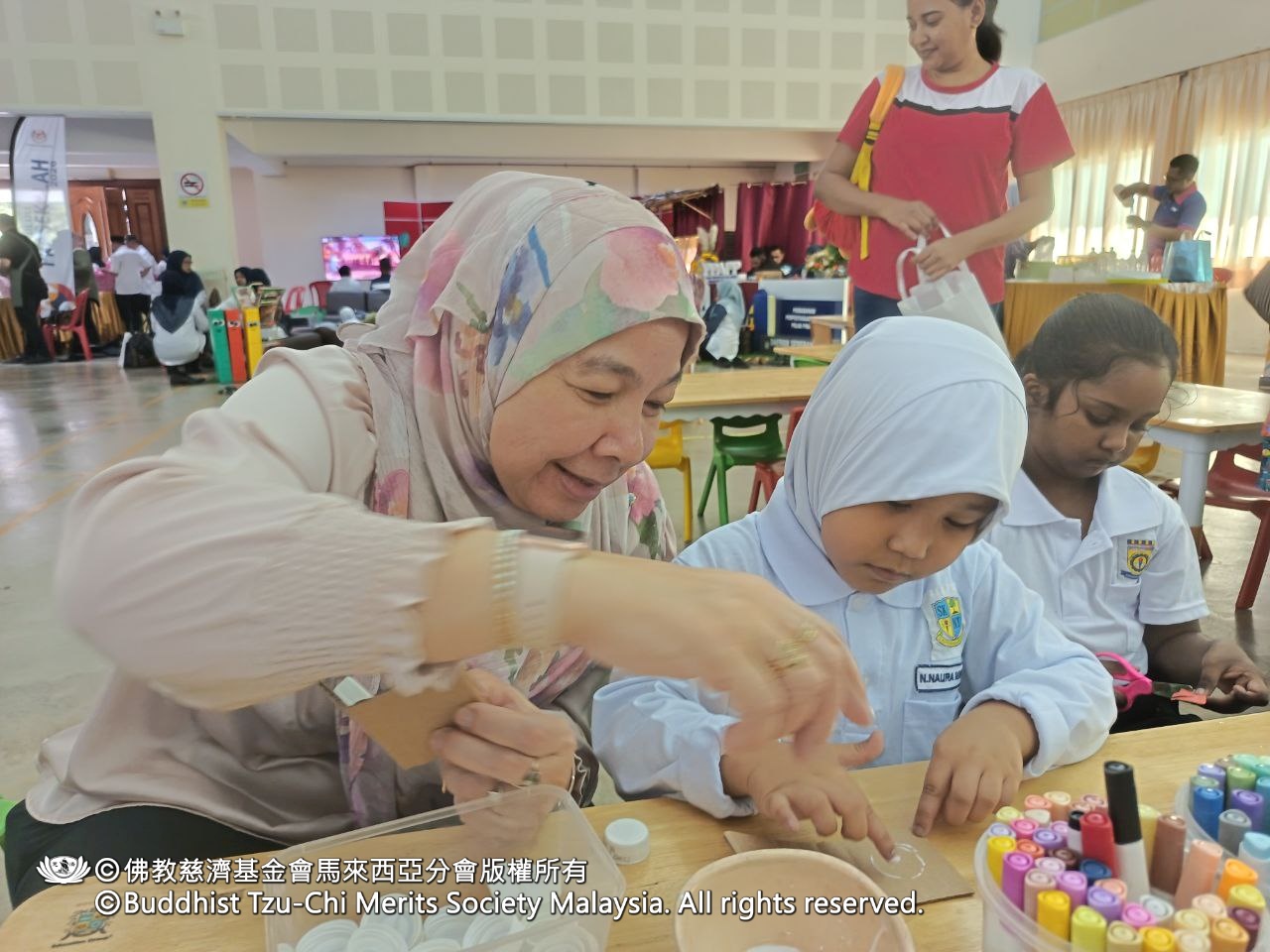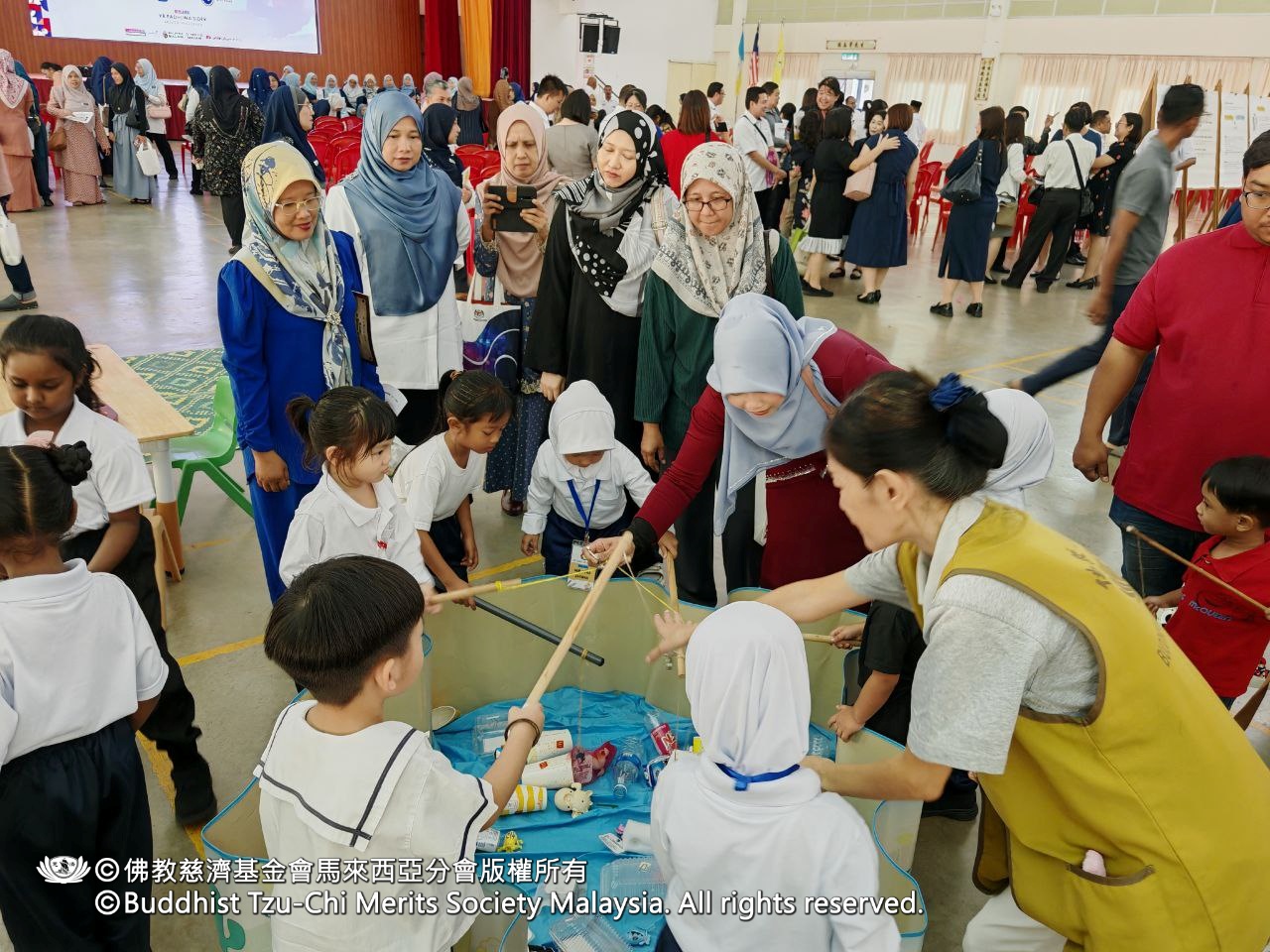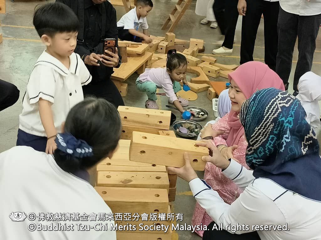 慈济幼儿园在现场设置了两个主题展示。其一为“爱护地球”,透过游戏引导孩子学习资源分类,并利用回收物制作精美的吊饰与简易乐器。教育部幼教课程副总监哈尔丽娜女士(Puan Harlina binti Mohamad)亦把握时机,亲自教导孩子们动手制作乐器。另一展示“环保池”同样广受欢迎,生动体现了将环保意识融入趣味活动的教育理念。