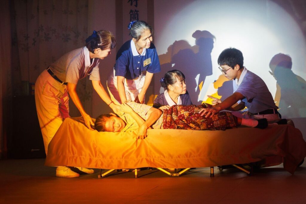 當我在戲劇中重新演繹自己,數年前照顧一位婆婆的畫面,一幕一幕在心中浮現。那一年,因為其他師兄師姐都在臺灣精舍上課,我獨自接下這個個案。當時看見婆婆不只癱瘓在床,身上還有四個嚴重的褥瘡,更因為在病房裡吵鬧而遭到院方拒絕繼續照護。那一刻,我既不懂醫療,也沒有照護經驗,心裡滿是不捨與害怕,只能不斷問自己:如果是上人,會怎麼做?