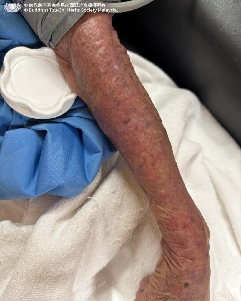 86 歲的腎友 Y 阿嗎,因皮膚嚴重乾燥及身上留置導管,近半年來無法自行洗澡,只能日復壹日地擦拭身體;那些洗不淨的體味與紅疹,像是甩不掉的負擔,伴隨著她照顧孫兒的疲憊,身心負擔不輕。