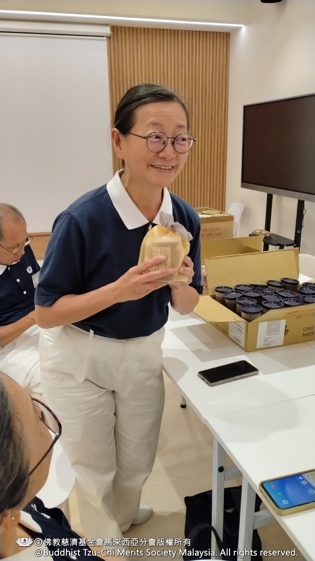 当天,慈济志工曾慈规、郑增发、陈婵琴与庄智文齐聚大山脚红蜻蜓幼儿园总部,在温馨的氛围中展开“腊八粥及岁末送爱活动”。曾慈规师姐分享此次送爱的三重意义:一是赠送腊八粥,传递节日祝福;二是岁末送上“福缘珍粥”。此物资源自证严上人的慈悲与智慧,自1992年以来即为冬令发放与赈灾物资,空罐还能化为存钱筒,延续惜福爱物的理念;三是传承竹筒岁月精神。郑增发师兄忆述当年三十位主妇日存点滴善款,六十年如一日汇聚成爱的长河,象征六十周年的红色竹筒更显意义深远。