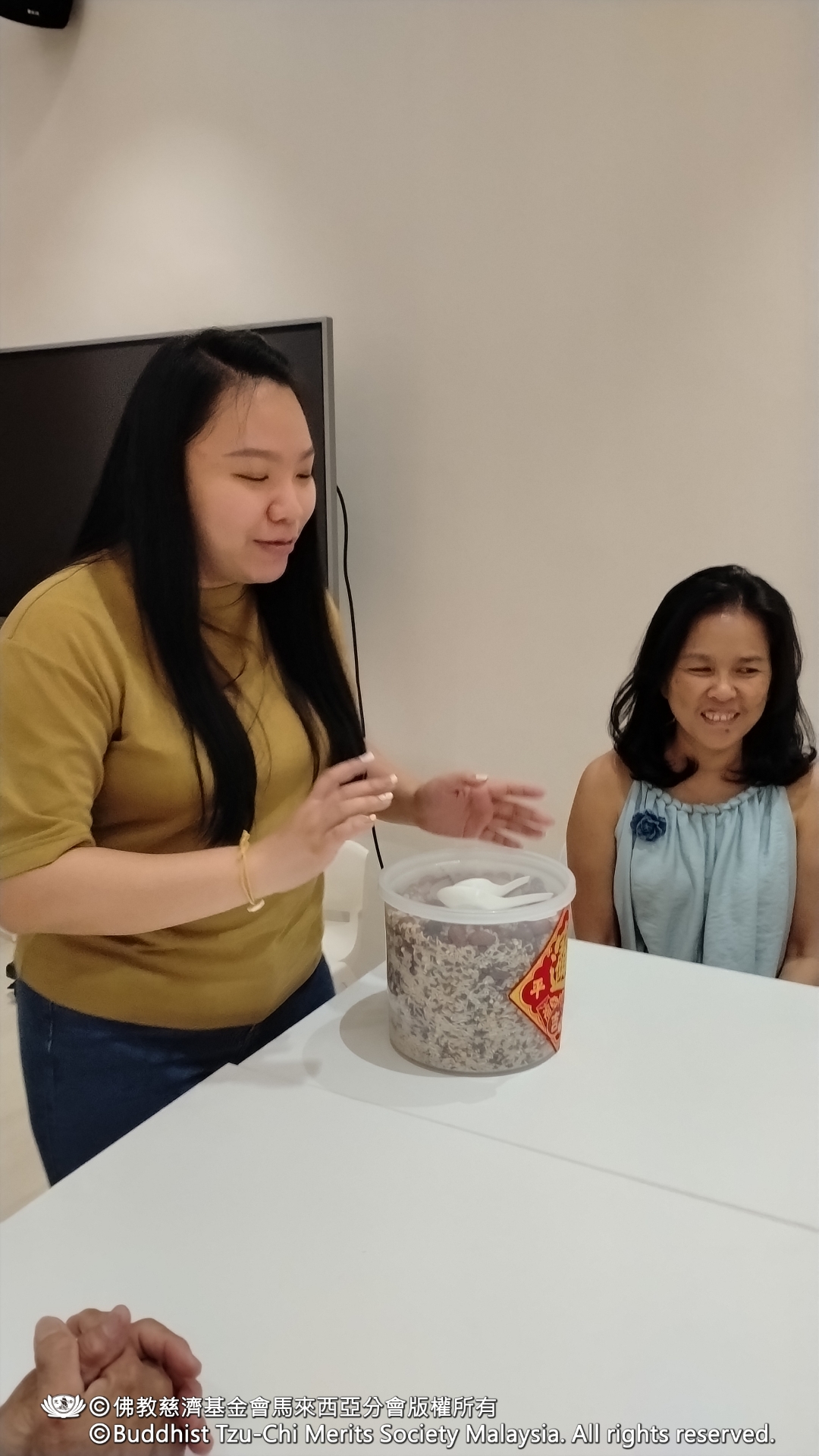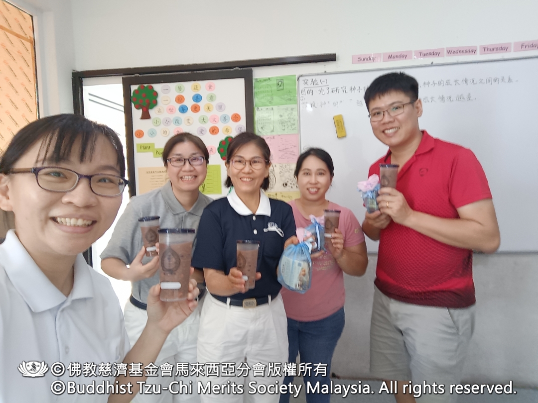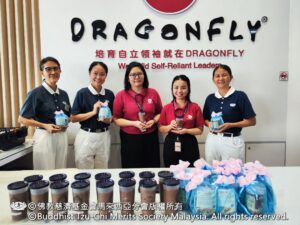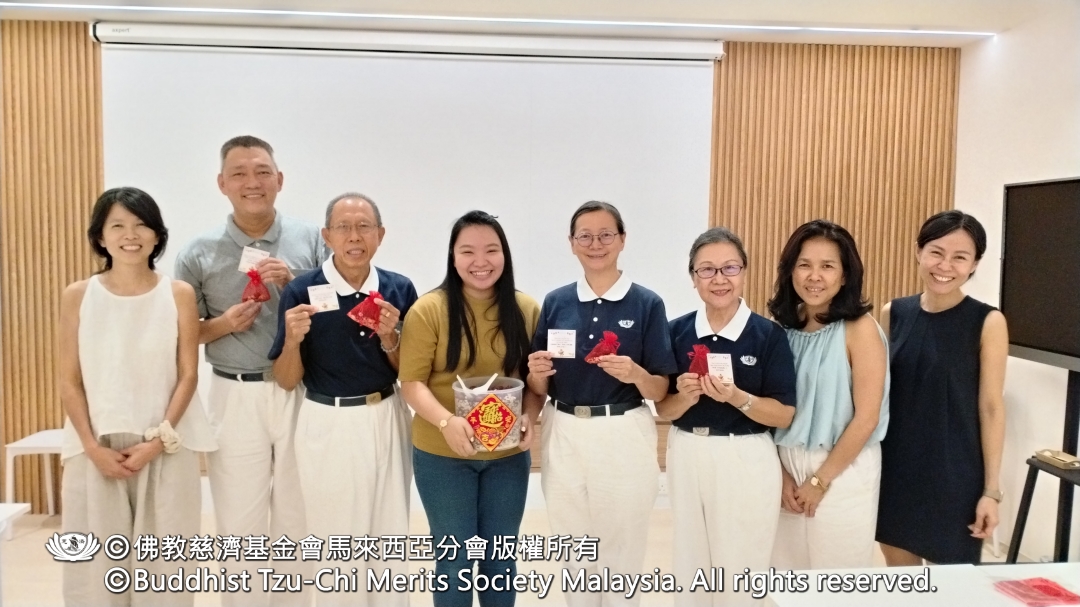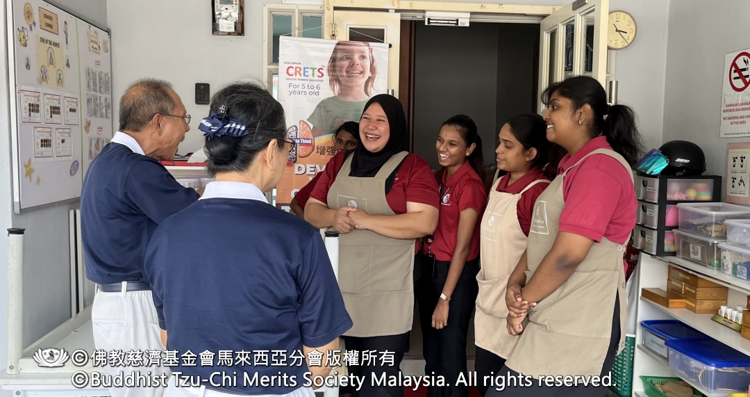 随后,志工与总部职员分组前往旗下九所幼儿园与安亲班继续送爱。在Kota Permai小状元安亲班,学生以百家米煮成的腊八粥及亲手制作的点心与志工结缘;Bukit Minyak红蜻蜓幼儿园也将师生平日投入的竹筒善款交予志工,把点滴爱心传递出去。
