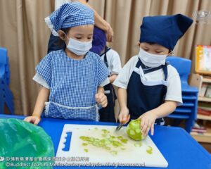活动开始,鼓声响起,为新春活动拉开序幕,大哥哥大姐姐带来活泼可爱的舞狮表演,引得小朋友们笑声连连。随后,孩子们在老师与志工陪伴下,动手洗菜、削果皮,包裹寓意“步步高升”的年糕春卷,制作水果串,淋上巧克力酱,寓意能巧妙克服困难的能力。