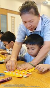 施老师不急不徐地陪伴着七岁的陈奕勳,步步引导,在剪刀起落间伴随着提示与笑语,让原本颤抖的小手渐渐安定。完成手作的那一刻,不只是作品的呈现,更是一场建立自信心的成长足迹。