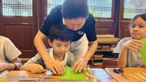 莲娥师姐用心的提示与示范编织草席要注意的事项,孩子们很认真的将每一条纸条都推紧、对齐。九岁的李承羽用心聆听、随即调整,将草席编的整整齐齐。进步就在一念之间。