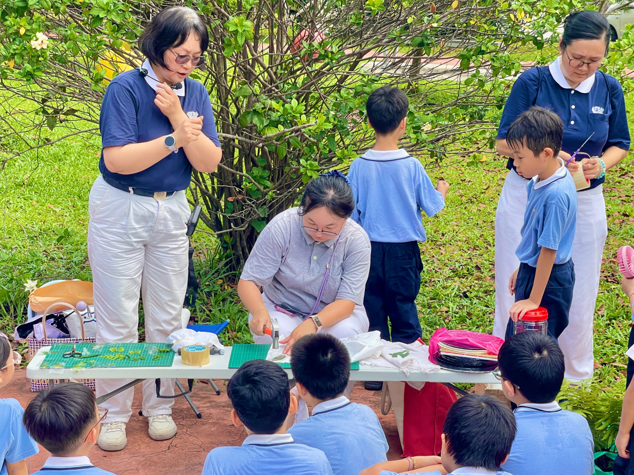 活動最後,親子們在師資示範與指導下進行葉脈拓印槌染 DIY。大家先在草地上尋找喜愛的葉片,再經鹽水浸泡、擦乾與槌染等步驟,將葉子的紋理印在布料上。一幅幅自然美麗的作品逐漸完成,親子們看著自己的成果,心中滿是歡喜。在互動與合作中,也增進了彼此的情感。