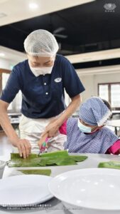 平日里最为熟悉的食材,其实承载着用心与理念。透过静思人文团队的引导,孩子们一步步了解食材的来源、制作的用心,以及背后所蕴含的清净、感恩与惜福之心。在烹煮净斯香烤蕉叶饭的过程中,香气四溢的不只是美味,更是一份对食物与生命的尊重。