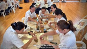 一句简单的游戏规则,立刻让现场热闹起来。有人小心翼翼地维持平衡,有人绞尽脑汁想办法,有人忍不住笑出声,也有人在失败后再试一次。原本看似轻松的团康活动,却在一来一往之间,让大家体会到:合作,需要默契;成就,需要愿力;而一点一滴的善,也总是在众人齐心中慢慢汇聚。