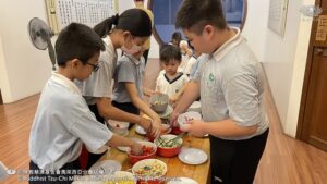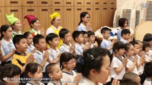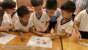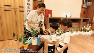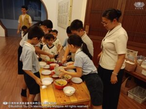 从一碗饭的由来体会众缘成就,学习感恩与惜福之心。认识食物金字塔实践健康餐盘,透过亲手制作蔬果沙拉,在简单清净的饮食中,体会“少欲知足、饮食有节”的生活之道。安心班的哥哥姐姐向幼儿园的弟弟妹妹分享素食名人的故事,传递爱护生命、守护大地的理念。